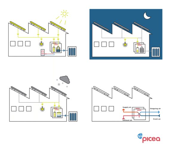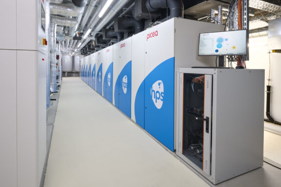 The system also uses the process heat generated and makes it available to the building. In addition to a high level of supply security, this results in an overall energy utilisation rate of up to 90%. In addition, the multi-picea supplies the building’s five heat pumps with solar power from its own roof in summer and winter.